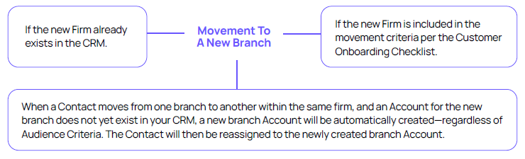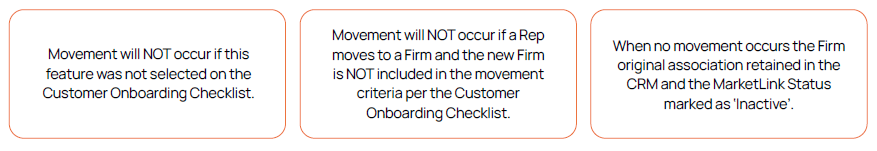 » Movement will occur if this feature was selected on the Customer Onboarding Checklist. The integration creates (if necessary) and associates the Rep to the appropriate Firm or Branch.